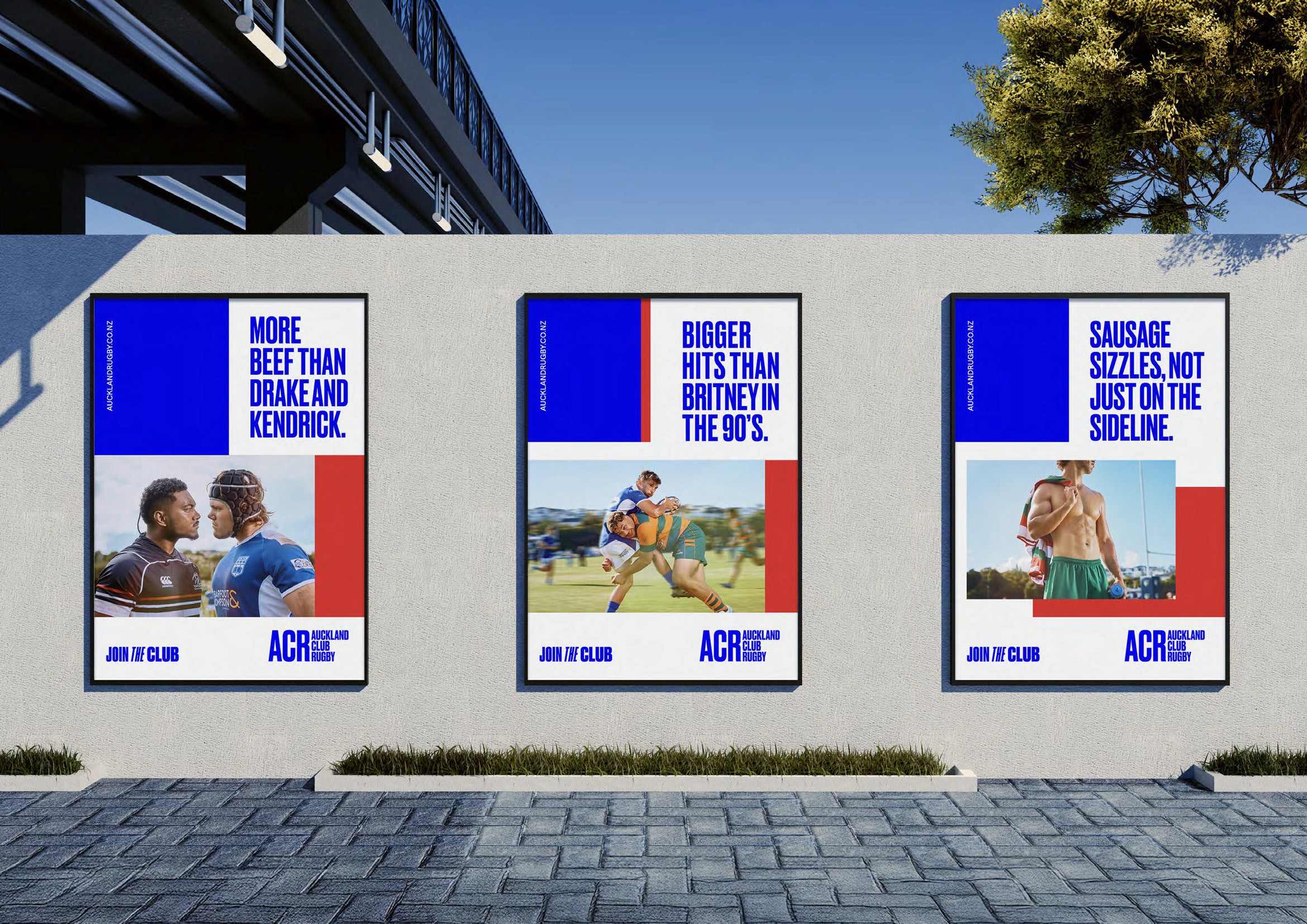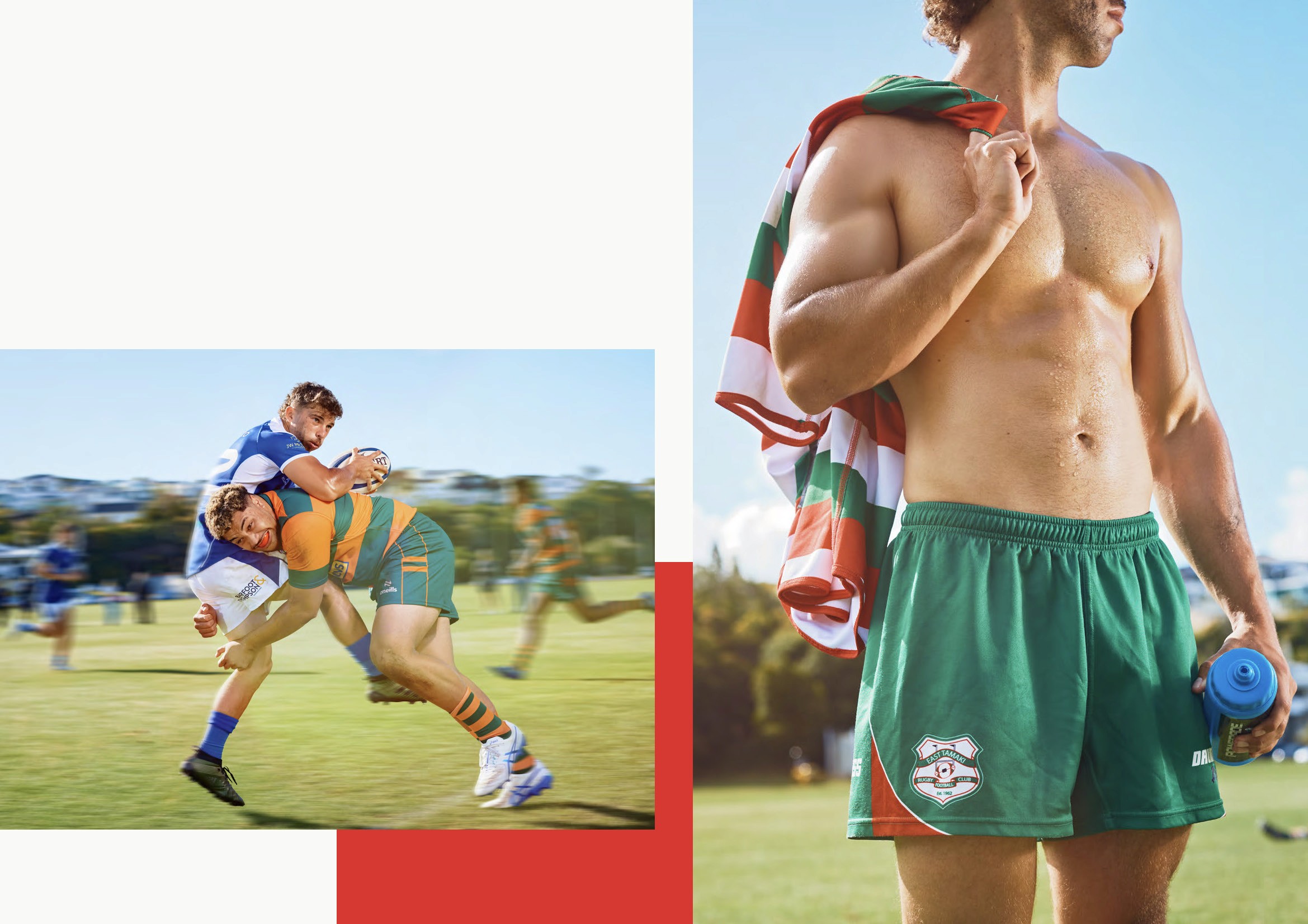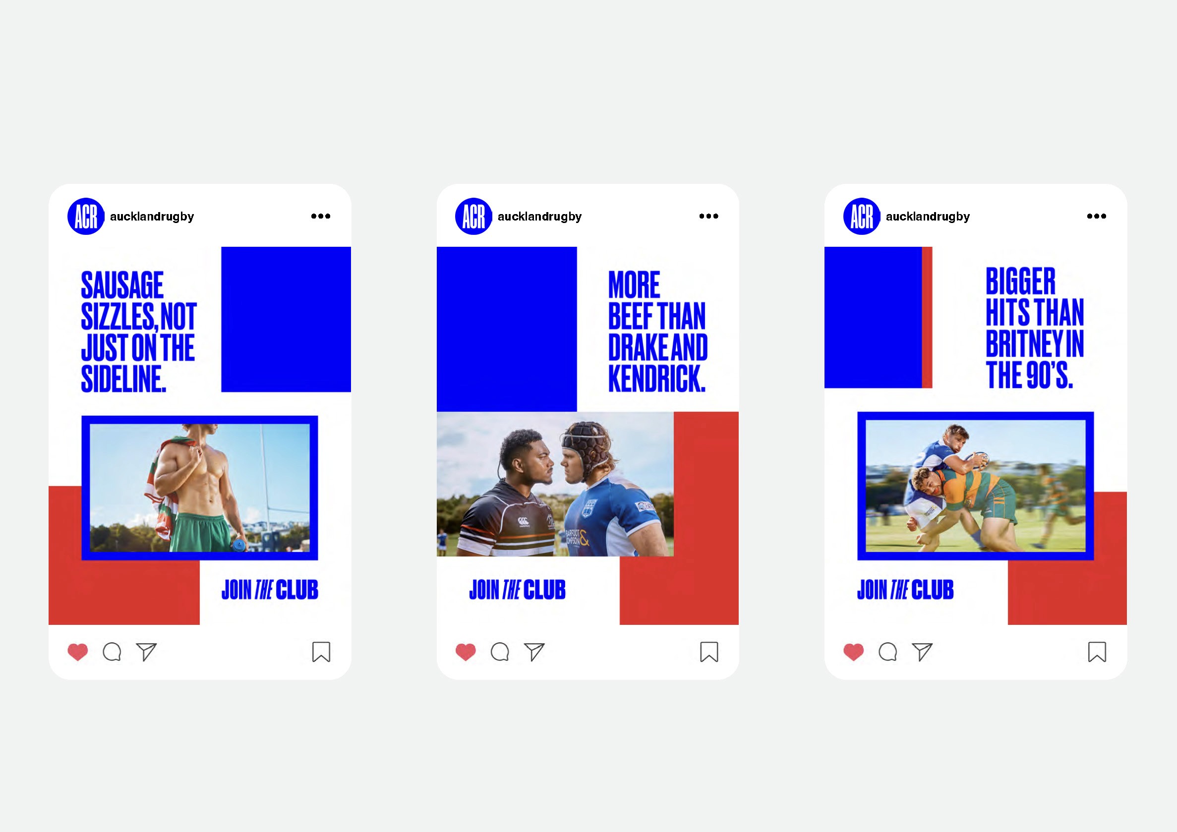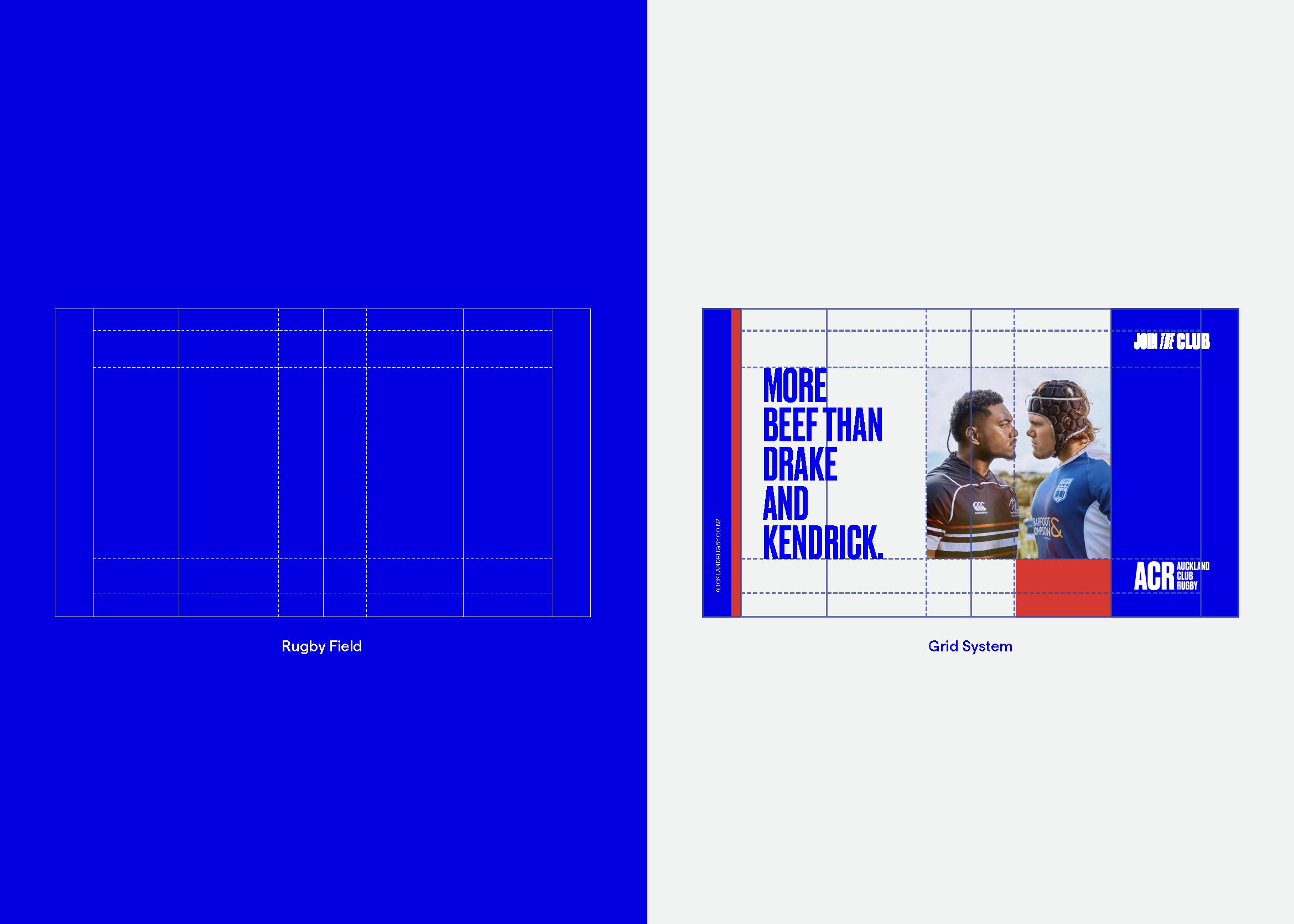 Ordered compositions that still capture rugby's energy — graphics and text break through lines or shift within the grid, mimicking the fluidity and unpredictability of the game itself. Photography art direction captures authentic moments through a contemporary lens, creating a fresh platform to build a movement that brings new generations to local club rugby.